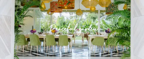 Geniesst den Abend im offenen, überdachten Pavillon – eingebettet in die tropische Gartenlandschaft – oder im klimatisierten Restaurant mit traumhaftem 270°-Blick ins Grüne.